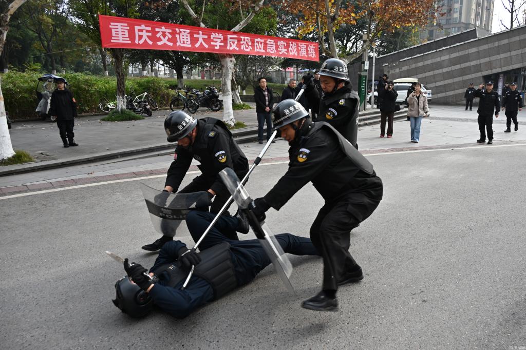 为提升重庆交通大学防暴应急的快速反应、高效处置及应对能力,强化校地联动,筑牢校园安全防护屏障,12月10日下午,学校联合江津区公安局特警支队在科学城校区南门组织开展了反恐应急实战演练。保卫处处长黄廷强,科学城学院、安保公司负责人及相关同志、“路石”先锋队学生代表等到现场观摩。科学城学院副院长王鹤主持演练。