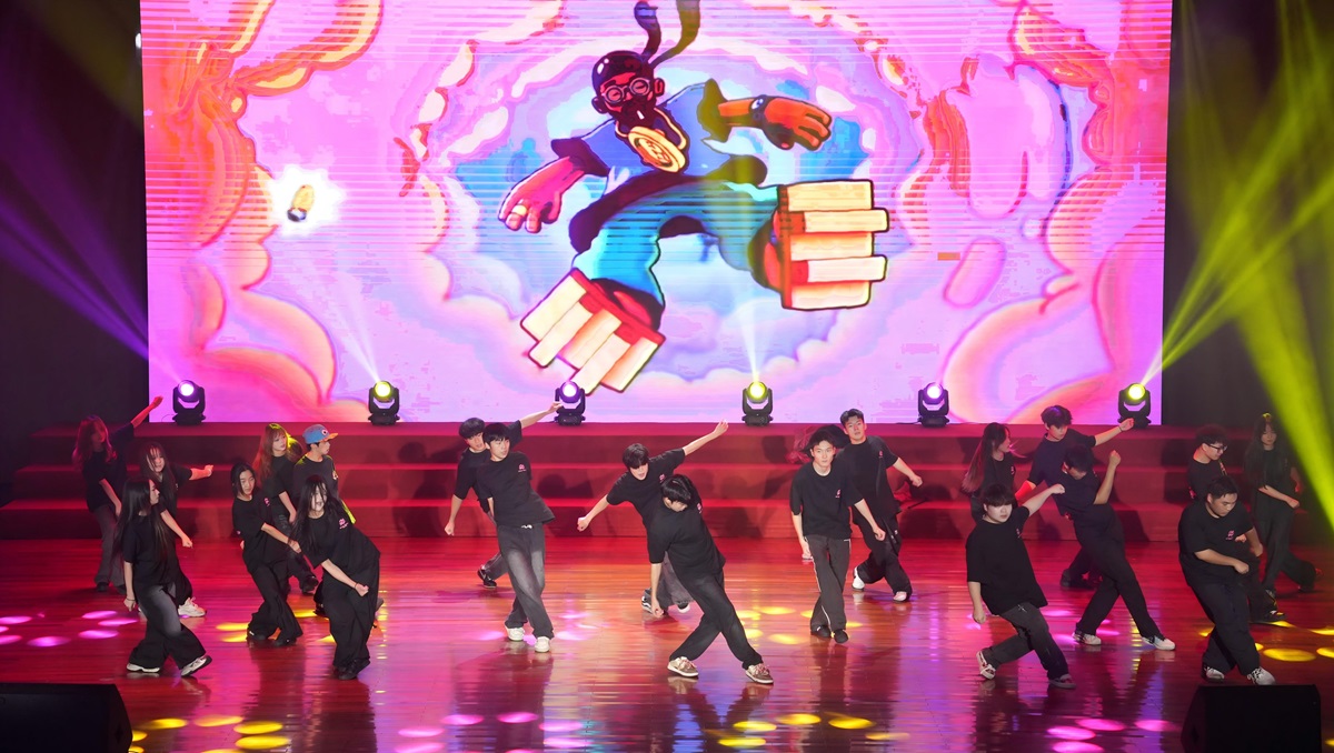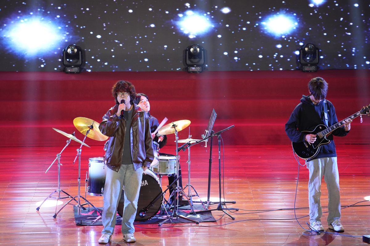 随后,大学生艺术团演唱歌曲《那些喊给天空的》,旋律舒缓,舞台营造出云海般的诗意氛围。晚会在爵士舞《万象盛典》中落下帷幕,动感舞步与绚丽灯光交相辉映,将现场气氛推向高潮。