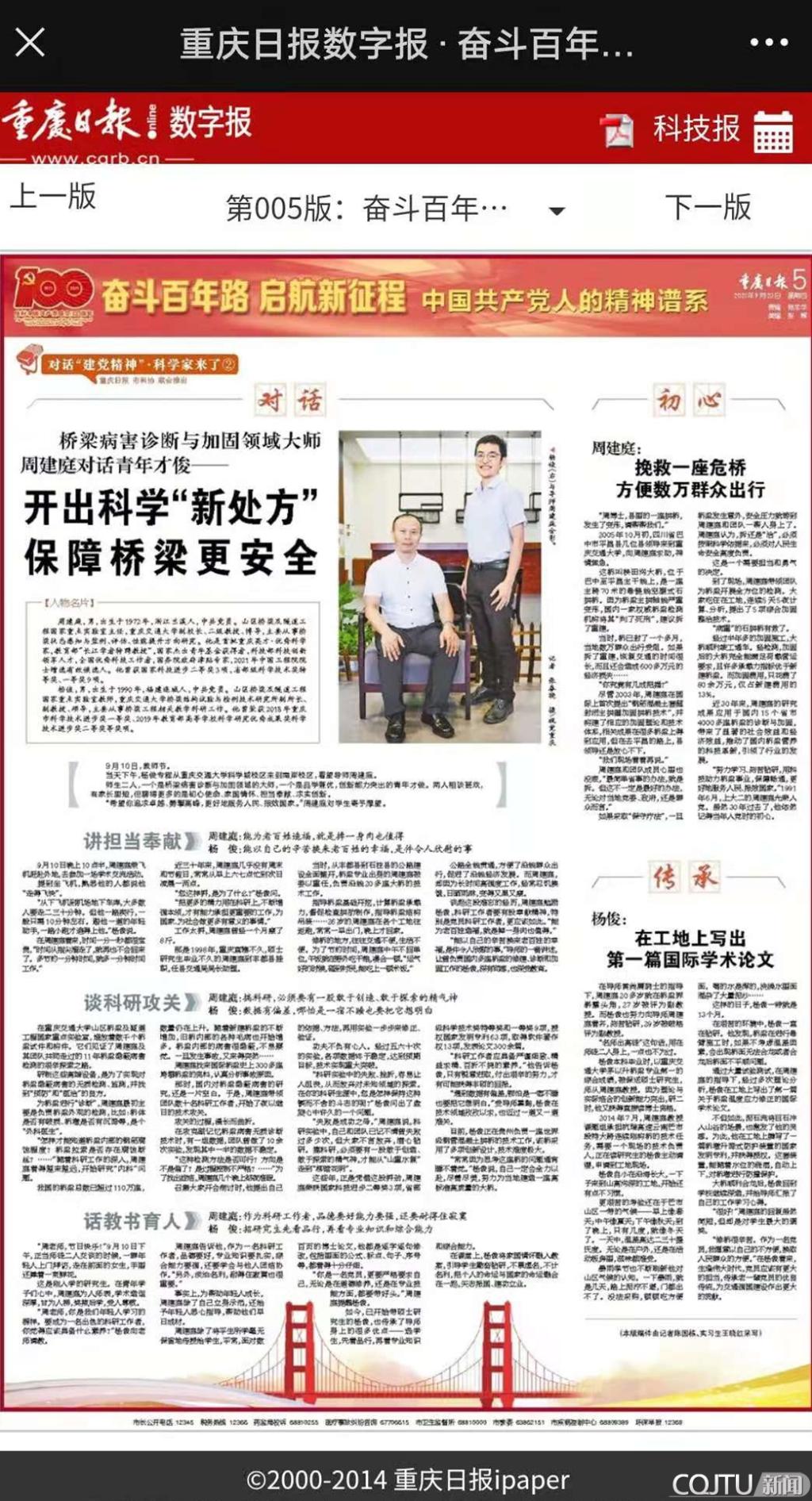 近30年来,周建庭的研究成果应用于国内15个省市4000多座桥梁的诊断与加固,带来了显著的社会效益和经济效益,推动了国内桥梁管养的科技革新,引领了行业的发展。