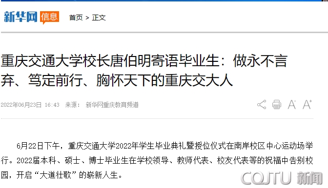 新华网:重庆交通大学校长唐伯明寄语毕业生:做永不言弃、笃定前行、胸怀天下的重庆交大人